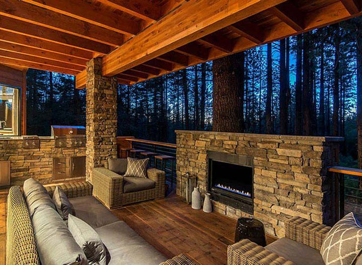 If the surrounding nature is picturesque, enjoy a calm dinner with candles. Create a piece of heaven for yourself and have a complete enjoyment. Especially if you live in a big city, romantic light of the night city would make it even more perfect! Choosing a wooden deck, you are getting a classical variant, but you can add some modern furniture and a glass fireplace to fulfill the relaxation zone.